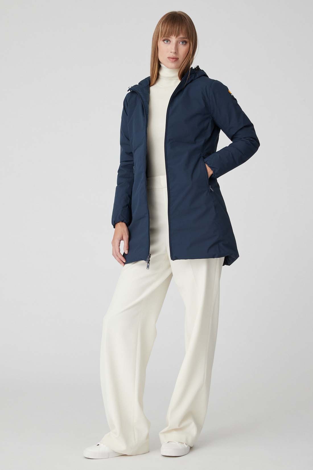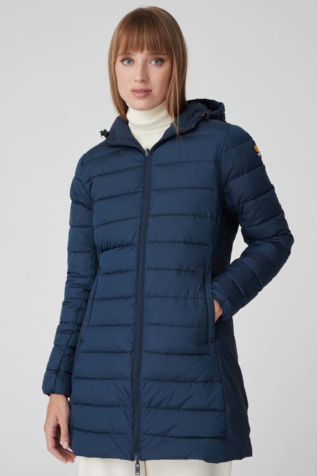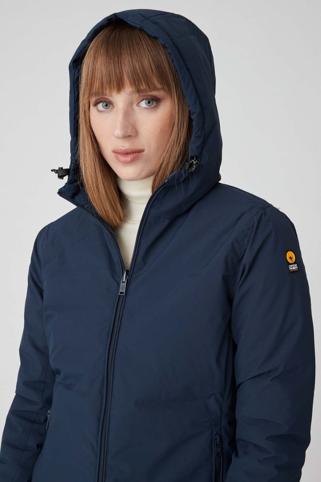 JUSY – Giacca blu reversibile con cappuccio, realizzata in tessuto 4 way stretch riciclato doppio strato. Il capo è caratterizzato da zip reversibili in nylon e in tono e logo istituzionale Ciesse Piumini. Da un lato il piumino si presenta liscio, dall’altro è caratterizzato da filze orizzontali, questa duplice anima contribuisce a valorizzare l’aspetto versatile, tecnico e dinamico del modello Jusy. Il modello Jusy rispecchia un’idea sostenibile poichè tessuti, imbottitura e zip sono riciclati.